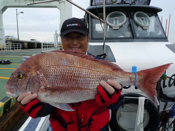 「こやつ、わざとタモ外すんじゃないだろか?」と小生は猜疑心の固まりに成り下がっておりましたが真鯛ちゃんがガンガン、バンバン引くので「ここは、信用してタモを任せるしか無いな!!」と観念しまして、ようやくランディングに成功しました。。。