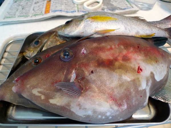 特筆すべきは、写真をご覧になるとお分かりかのように、各魚の「大きさ、サイズ」にあります。シンクをオーバーするくらいでっかいイサキとウマズラカワハギさんが拙宅に4尾来たのでした。。。