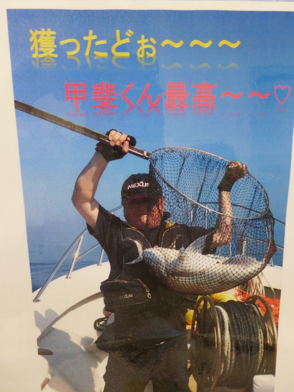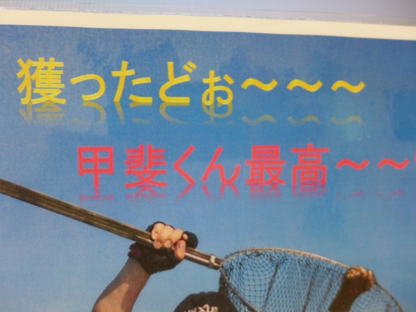 でっ、ですね、、、T将丸賛のホームページに小生の写真が載っとったもんですから甲斐店長に「チェックしときなっせ!!」とメッセージを伝えましたトコロ、、、昨日、「釣具のピンポイント」に乱入しましたラバ下の写真のような「甲斐君最高!!」ってな、ネーム入りのご丁寧にパウチまでしてありますコピーを小生にプレゼントしてくれたのであります。。。